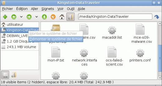 Clicking on the “unmount” option will deactivate the device after the system has checked that data have actually been written. If the directory currently shown at this moment in the file manager is hosted on the device being unmounted, then the file manager will empty the file and directory list on the right since it is no longer accessible. This is a good way to know when the device is unmounted because there is no information notification to indicate it.